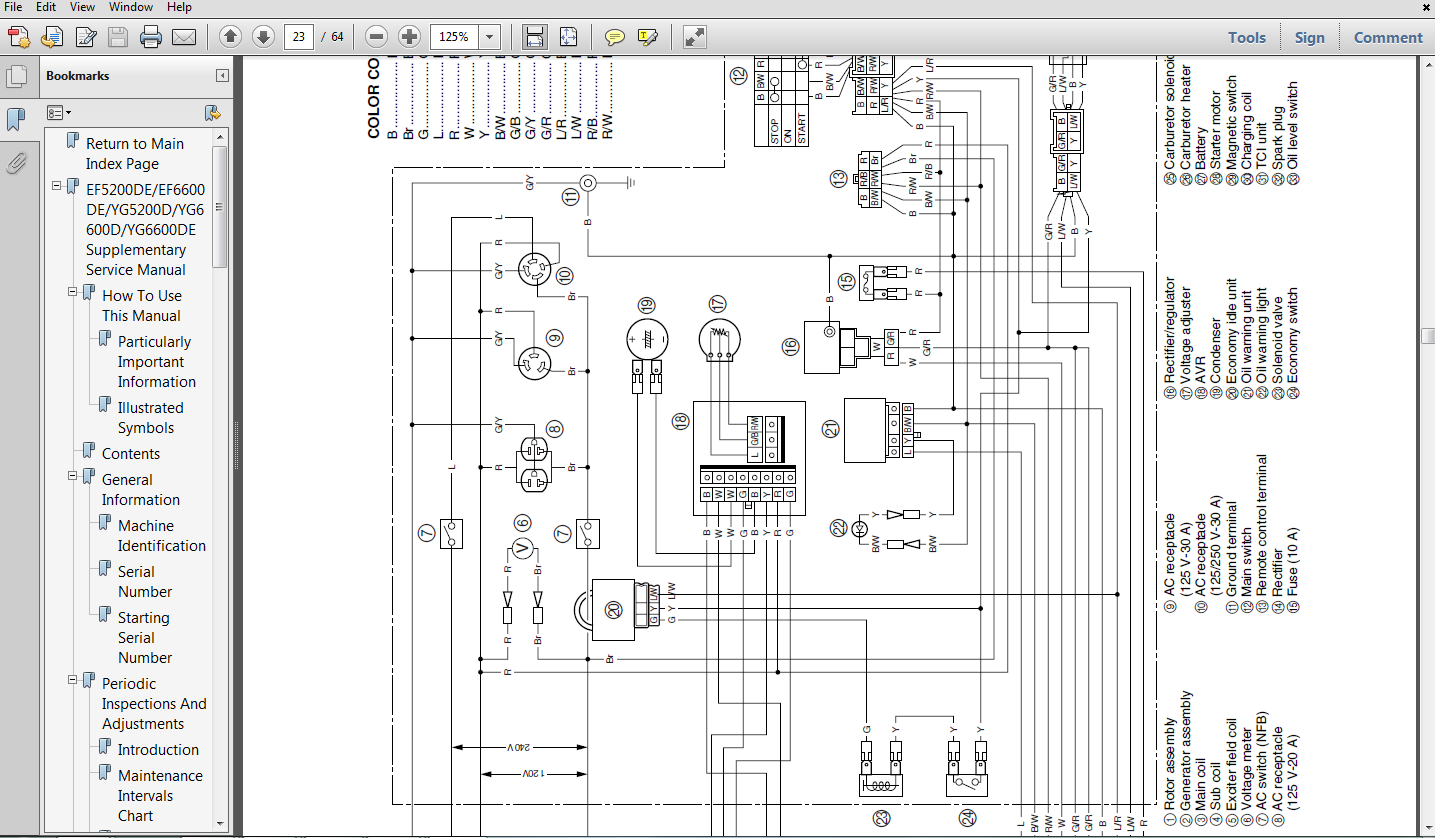 Yamaha EC2000 Generator Service Manual. The procedures in this manual are organized in a sequential, step-by-step format. The information has been compiled to provide the mechanic with an easy to read, handy reference that contains comprehensive explanation of all disassenbly, repair,assembly and inspection operations. Each chapter provides exploded diagrams before each disassemblysection for ease in identifying the correct disassembly and assembly procedures.